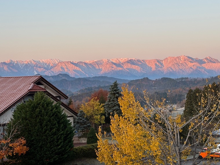 朝焼けに染まる北アルプス。