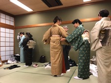 英語で、着物を着て、茶道体験をするというイベントです。まずは着付けから。箪笥の肥やしになっている着物を着たいわ外国人に着付けをするときのために着物を着る機会がなくてみんな着物美人〜。 |