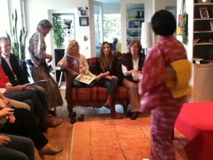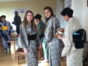 試着をして喜んでいただき、重いけれど持ってきてよかった! いろいろな結びの帯が興味深かったようです。 |