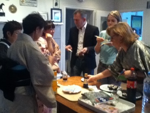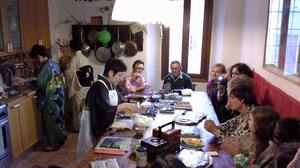 お寿司体験も大賑わい。そして外のぶどう棚の下では試食が大人気! |