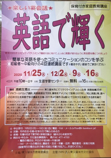 今年の「英語で輝く」はマスクをしてしっかり感染対策をとりながらの開催でした。11/25、12/2、12/9、12/16 4回回連続講座です。例年の半数の16名の募集となりました。 応募者多数のため、抽選とさせていただきました。 |